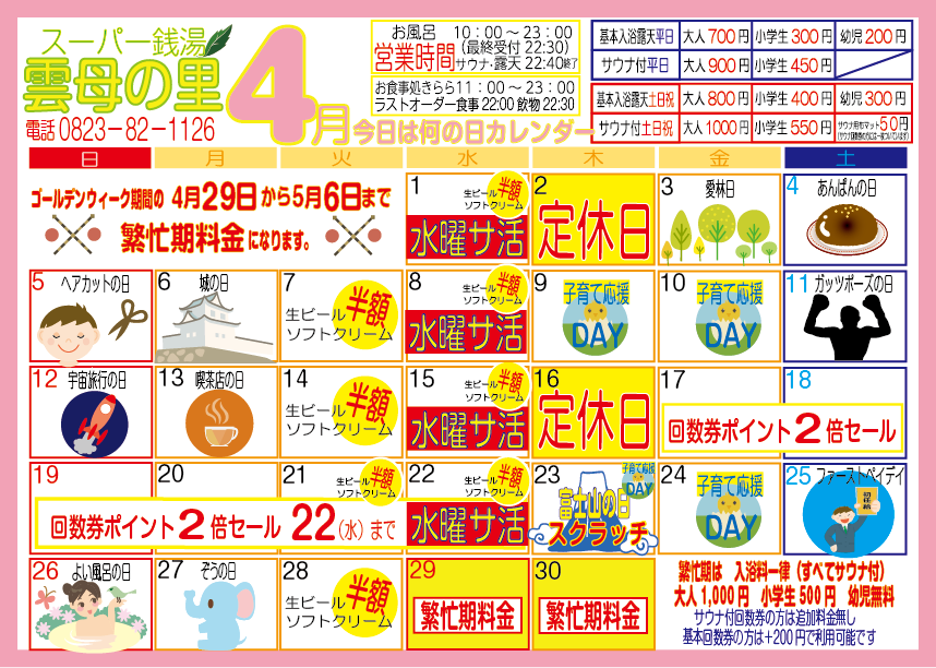 | 平日 / 土日祝 | 基本・露天 (土日祝) | サウナ (土日祝) |