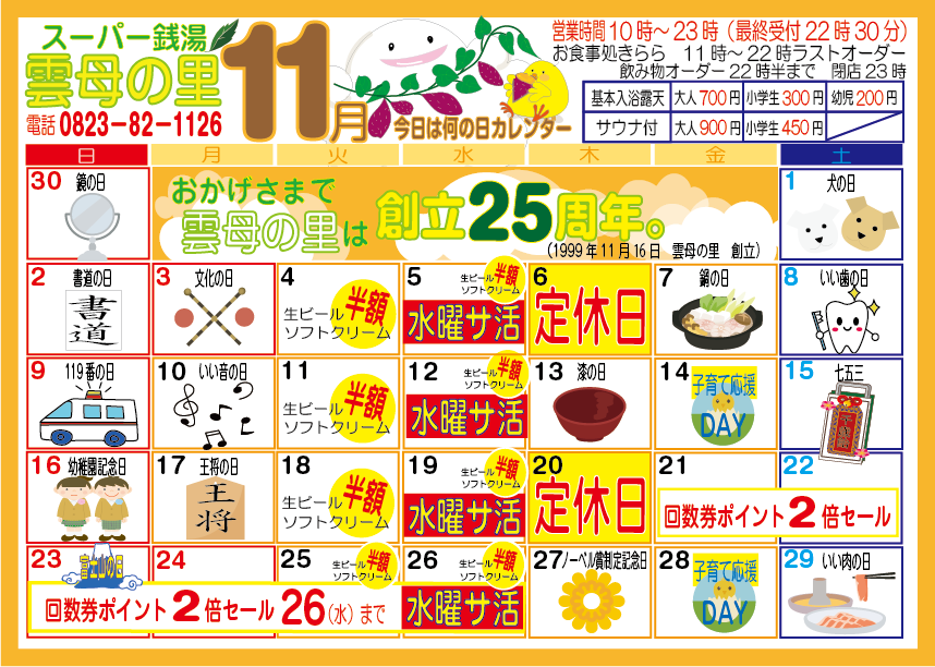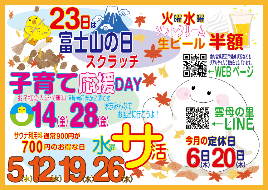 - ・店休日 第1木曜(6日) 第3木曜(20日) ・ソフトクリームと生ビール半額 火曜水曜(4日、5日、11日、12日、18日、19日、25日、26日) ・水曜サ活 基本入浴料金(大人700円)でサウナご利用なれます 平日水曜日(5日、12日、19日、26日) ・子育て応援DAY 小学生以下入浴無料*保護者同伴 第2金曜日(14日) 第4金曜日(28日) ・入浴回数券ポイント2倍セール 21日(金)〜26日(水) 回数券ポイントが2倍!20ポイントで1冊(11回分入浴)プレゼント ・富士山の日 毎月23日。 入浴のお客様にスクラッチカード1枚進呈 1等:入浴回数券1冊(11回分入浴) 2等:景品 3等:入浴券1回分orオリジナルタオル(どちらかお選び下さい) 4等:ポイント券(1ポイントでヤクルト1本、半券と合わせて15ポイントで1回入浴無料)